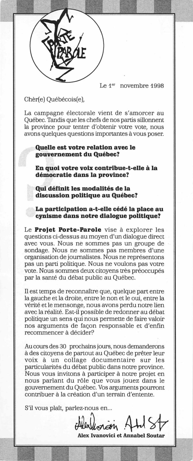 Le Projet Porte Parole vise à explorer les questions ci-dessus au moyen d’un dialogue direct avec vous. Nous ne sommes pas un groupe de sondage. Nous ne sommes par membres d’une organisation de journalistes. Nous ne représentons pas un parti politique. Nous ne voulons pas votre vote. Nous sommes deux citoyens très préoccupés par la santé du débat public au Québec.
